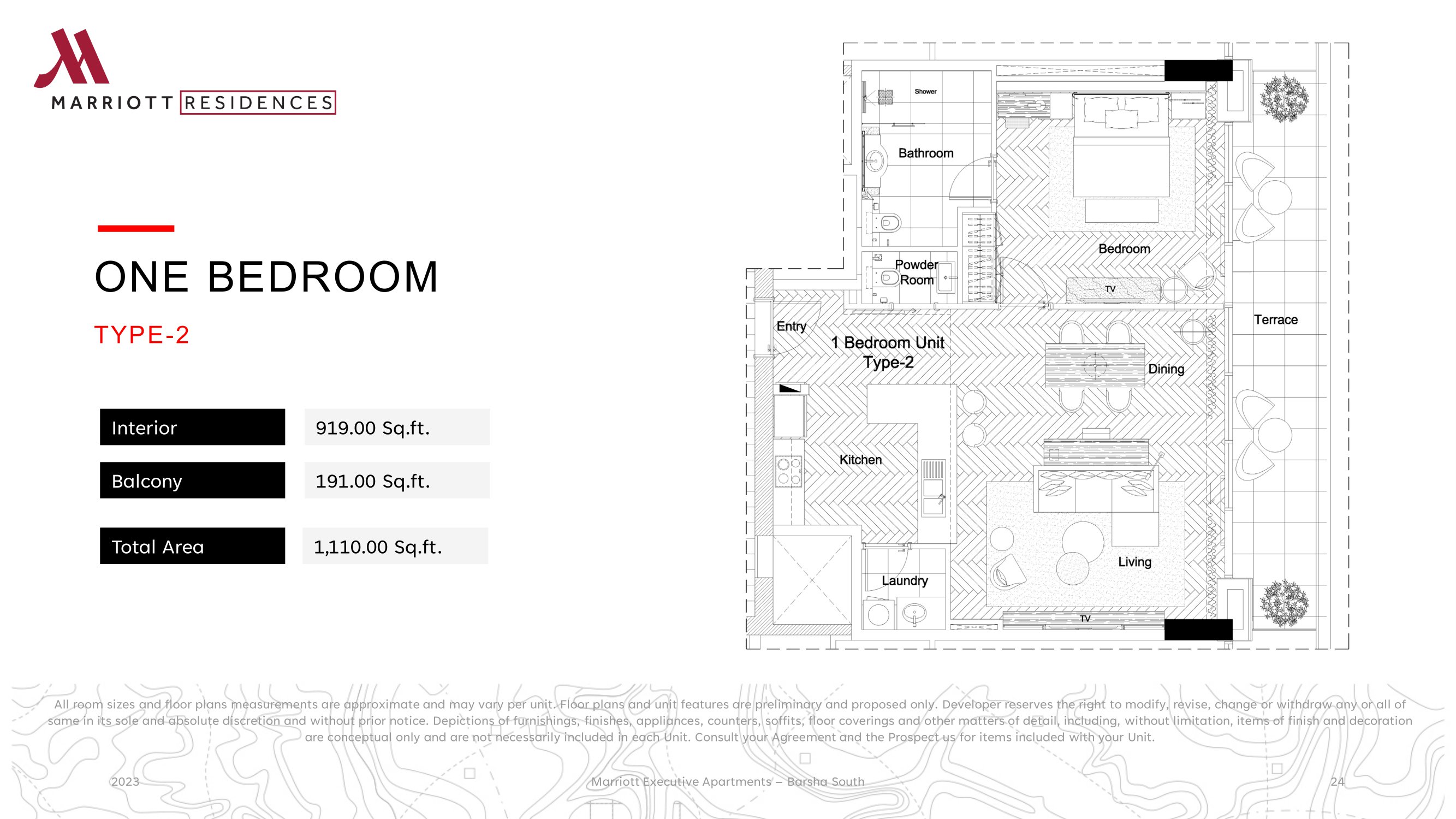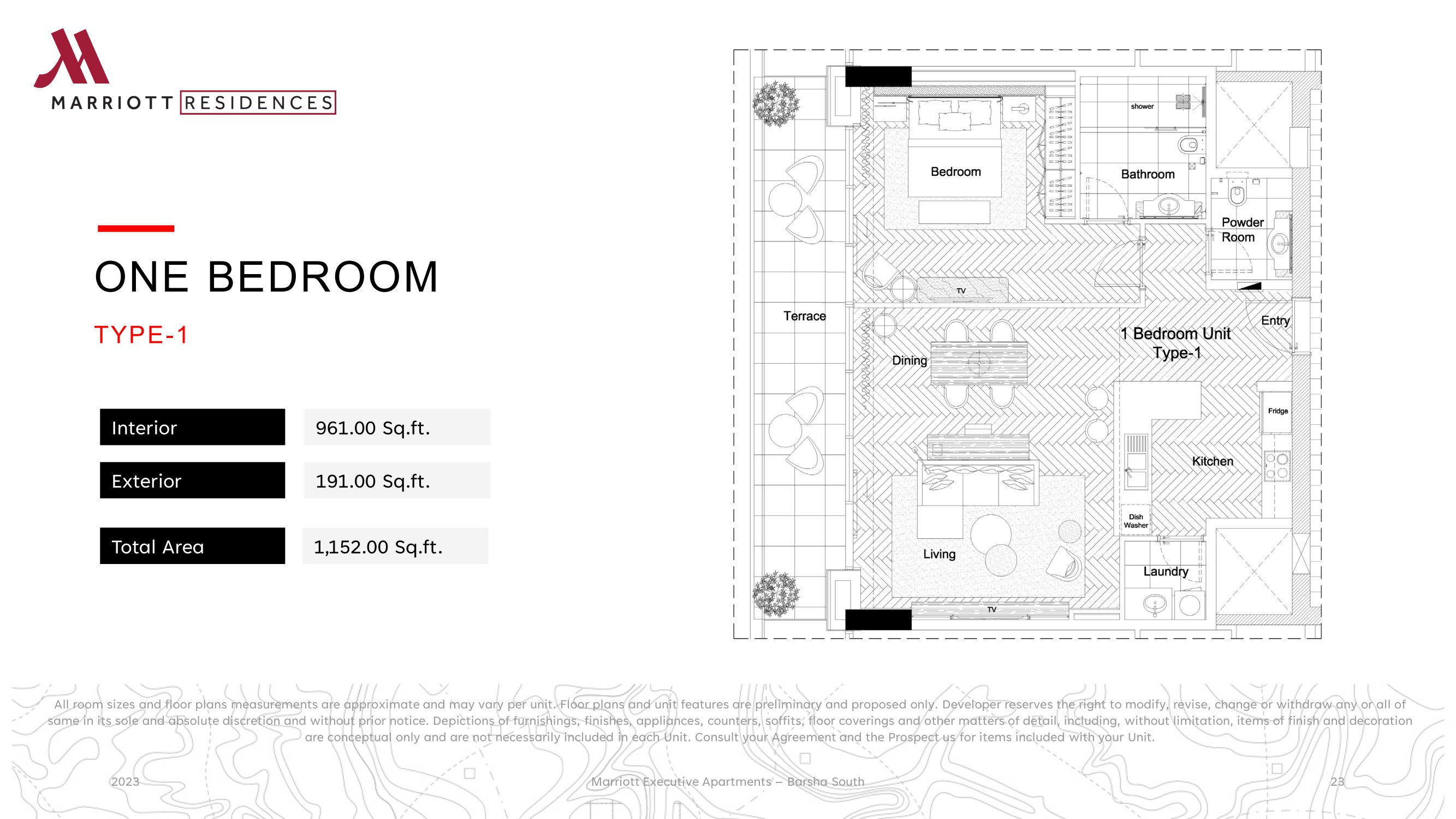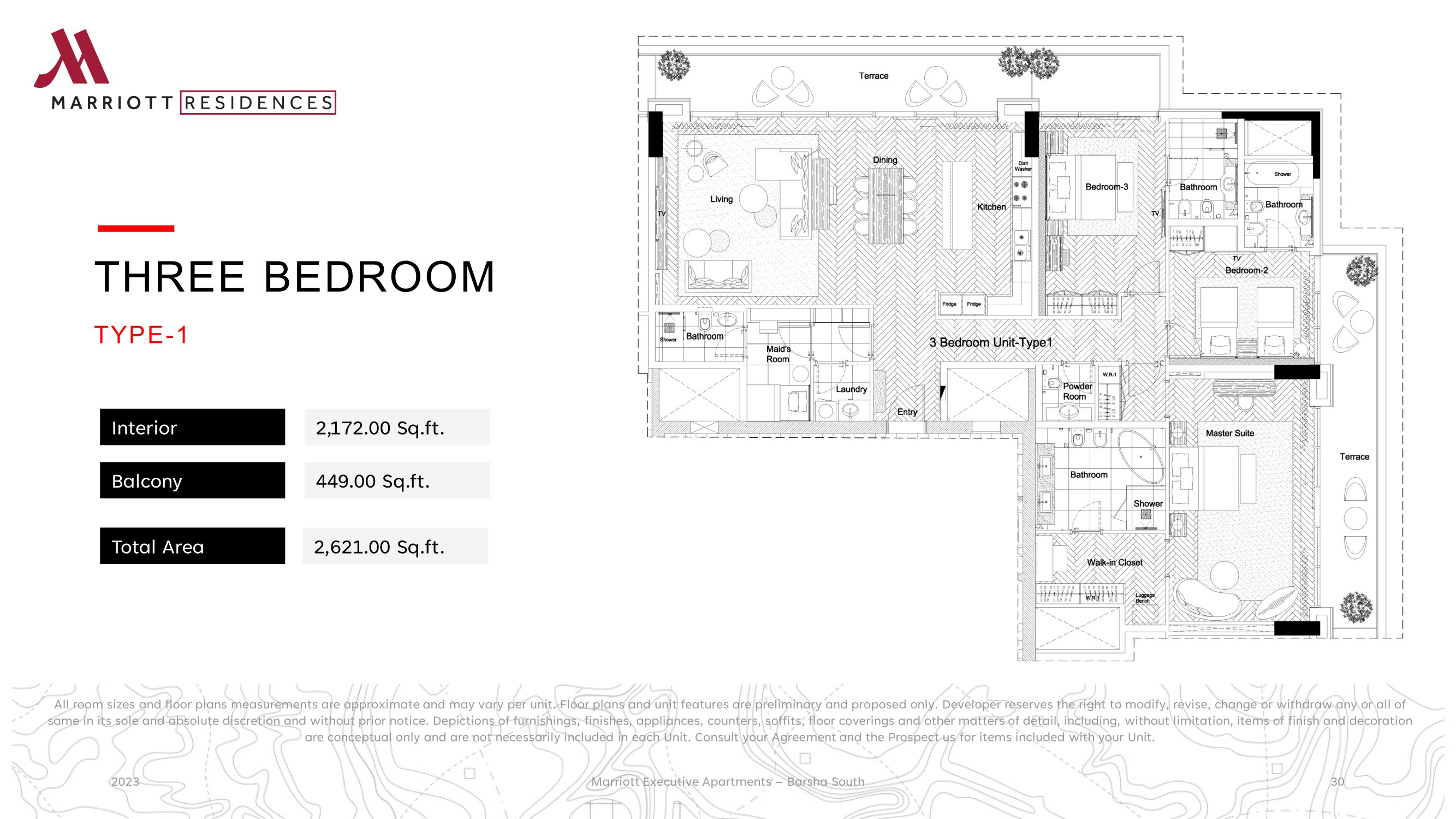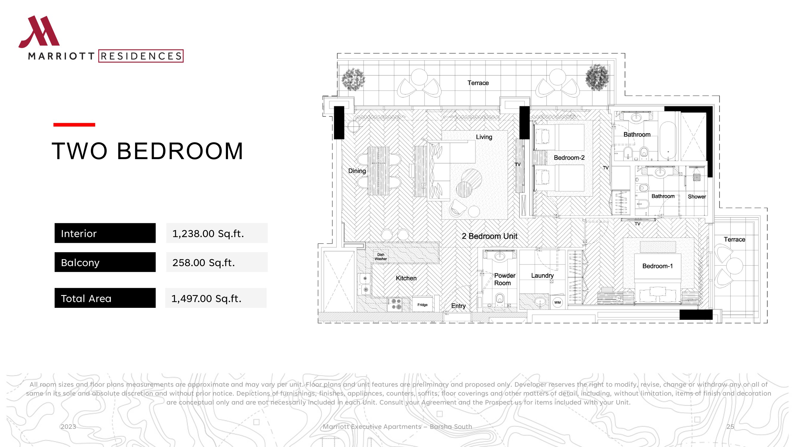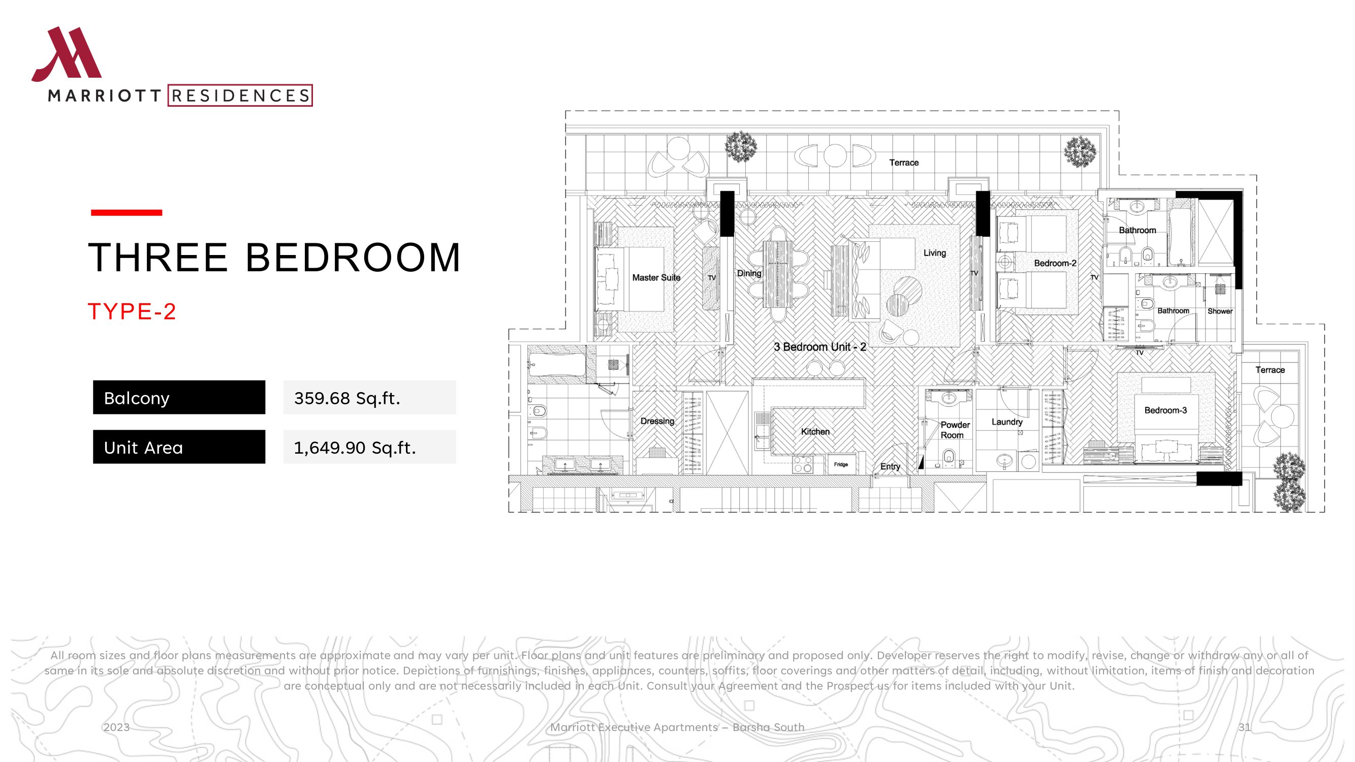 Property is an existing Apartment building in Barsha South that are being considered to be branded as Marriott Executive Apartment. The Development is located on Umm Suqeim Road opposite of Sheikh Mohammed Gardens. Part of Mohammed Bin Rashed City, it is in close proximity to Dubai's most famous commercial destinations - Dubai Hills Mall, Mall of the Emirates, 10 minutes from Madinat Jumeriah and Burj Al Arab, and 15 minutes from Dubai Mall and Burj Khalifa. It comprises of 3 Towers over common Podium where the Pool Garden is located, 3 common underground levels of 500 car park, storage’s, plant rooms, staff facilities, back of house kitchen and delivery bay. Ground Floor will welcome the Hotel lobby, Marriott Lounge, Meeting room spaces, All Day Dining and 2 specialty restaurants The building complex hosts a collection of 411 high-end apartments ranging from 1 bedroom to 3 bedroom as well as penthouses. All apartments are spacious and newly re-furbished with excellent view of Dubai skyline.